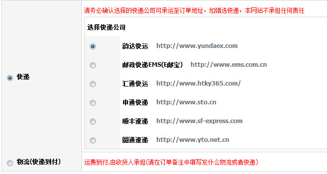 快递运输收费标准:请点击 “合作快递运费” 来查看